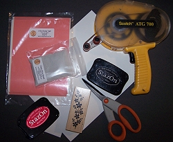 Gather your supplies. Choose the rubber stamp you want to use and cut a piece of O'So Sticky Tape to size. Choose coordinating cardstock and cut to the size you need to layer and decorate a card.