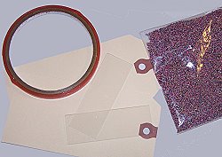 Place a microscope slide in the center of the cut out tag. Adhere the tape, halfway onto the tag and halfway onto the slide, all the way around the opening. I used 1/4" O'So Sticky Tape. Repeat on the other side. Then remove liner and cover exposed tape on both sides with micro beads. I used a combination of sizes in clear, black, copper, and brown.