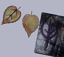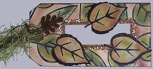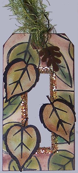 Stamp leaf image onto die cut leaves, color in areas as necessary with a felt tipped pen. Attach to tag with foam tape. Attach fiber to card and then attach charm to tag with fiber.